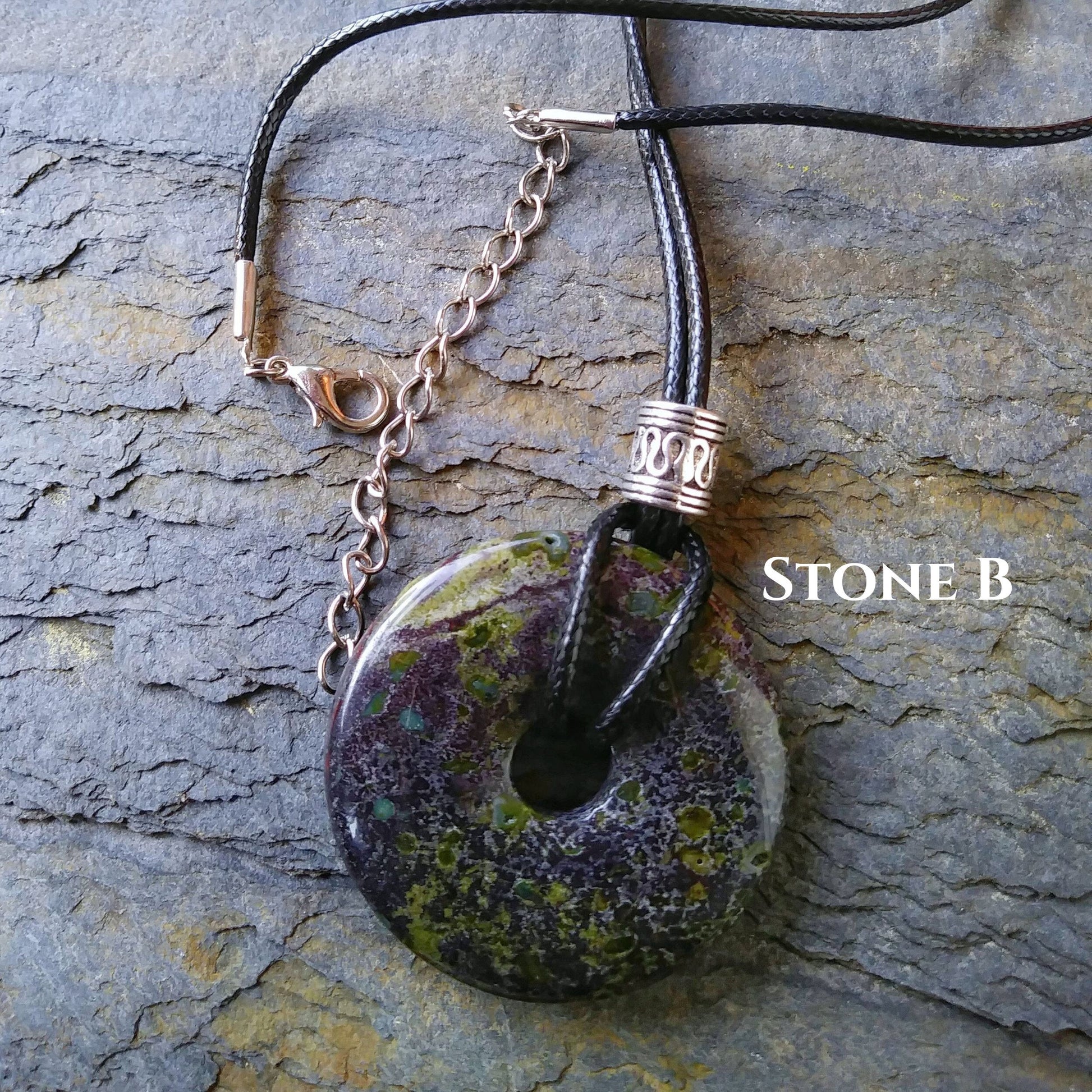The greens and reds of polished Dragon Blood Jasper evoke the play of sunlight on the leaves and branches of a spring or summer forest. The striking semiprecious stone has been cut into a polished donut ring hanging from a simple waxed cotton cord. Dragon Blood Jasper symbolizes courage and is perfect for anyone who may be thinking about life's many transitions: new jobs, graduations, the turning of the years. Or perhaps you just like the play of colors on polished natural stone and want to show off your own unique style!