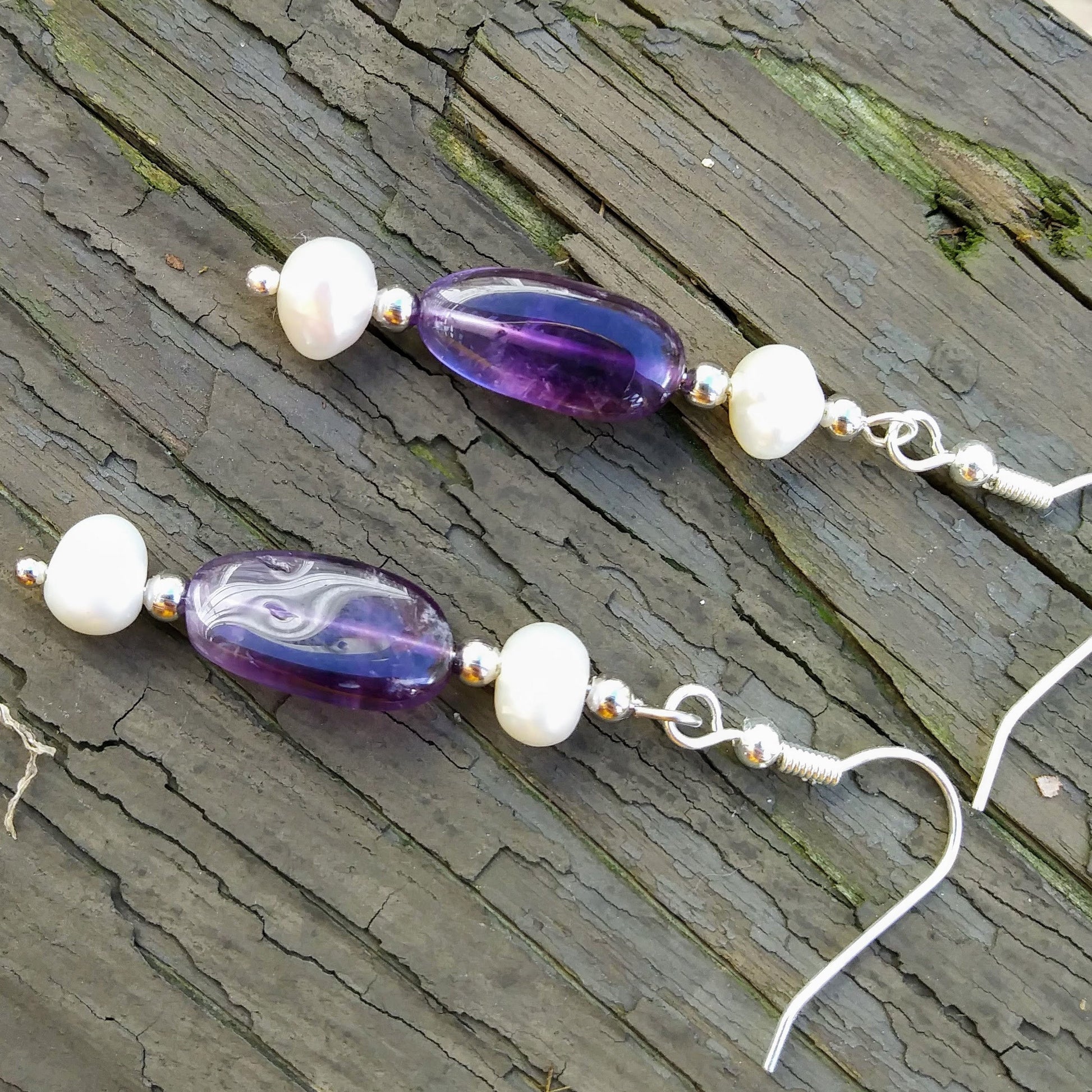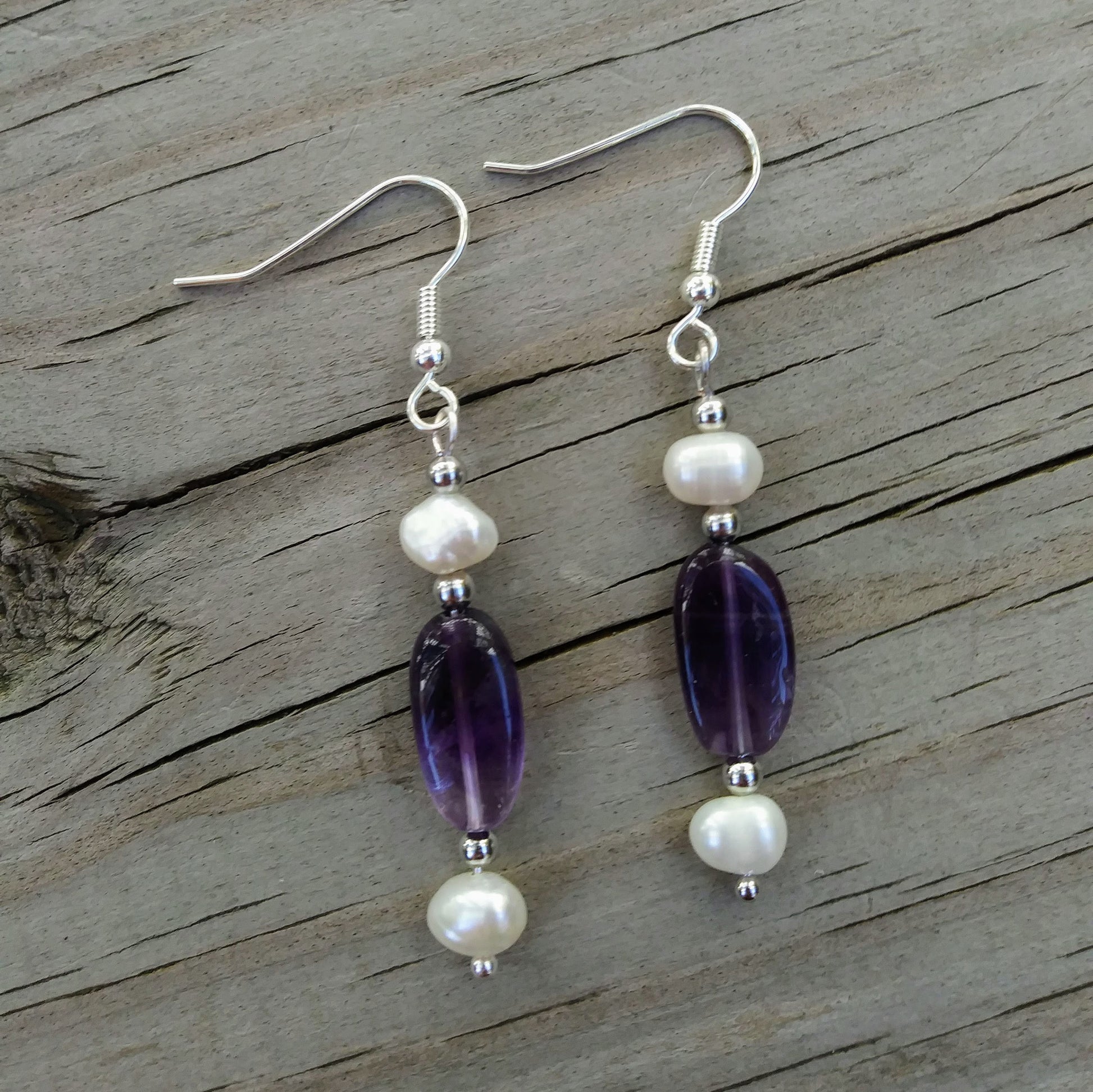 Deep Purple Amethyst & Double Pearl Silver Dangle Earrings