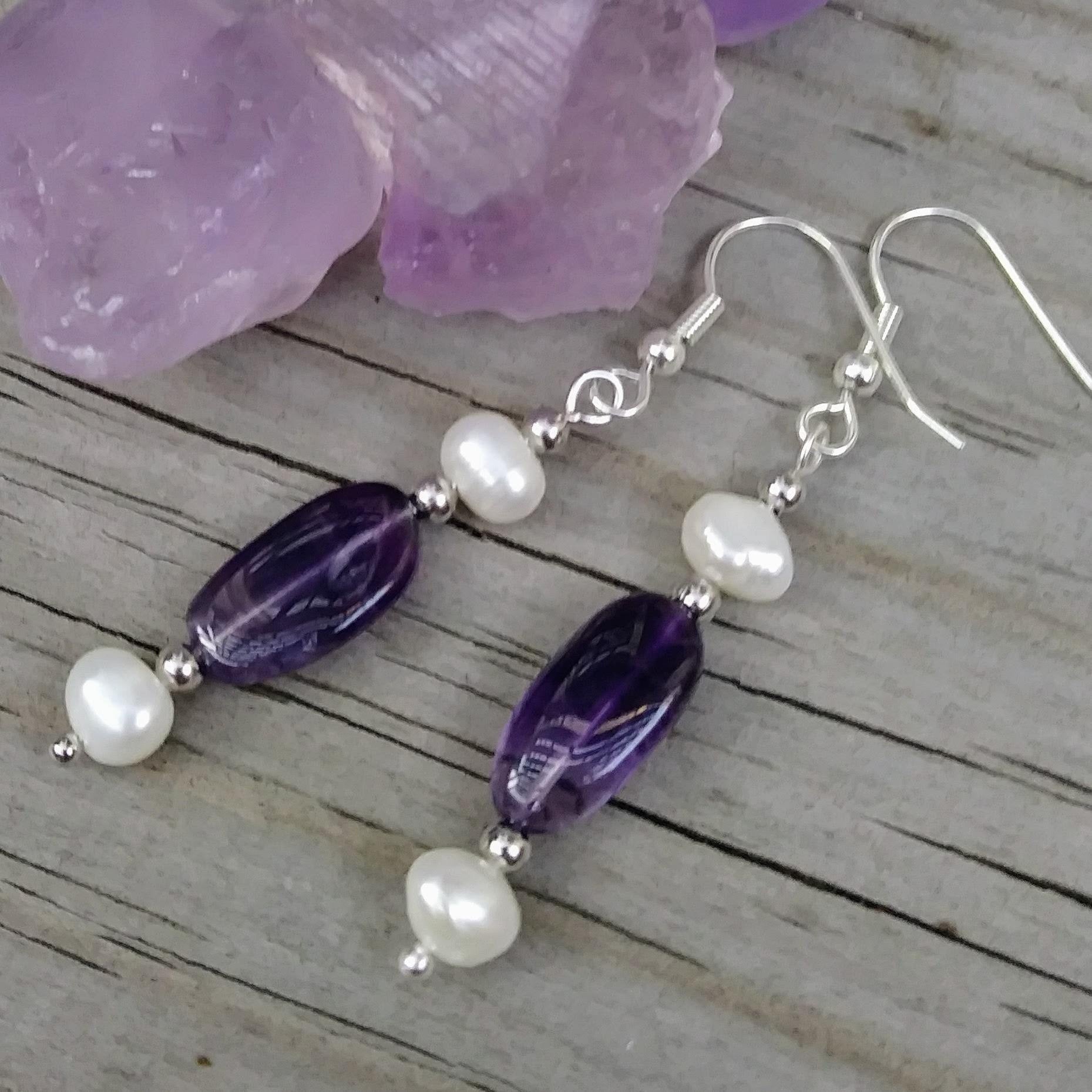 Two classic gemstones are united in these elegant earrings. These are the perfect jewelry gift for the holidays, especially for someone with a birthday in February (birthstone= amethyst!) or June (birthstone= pearl!)