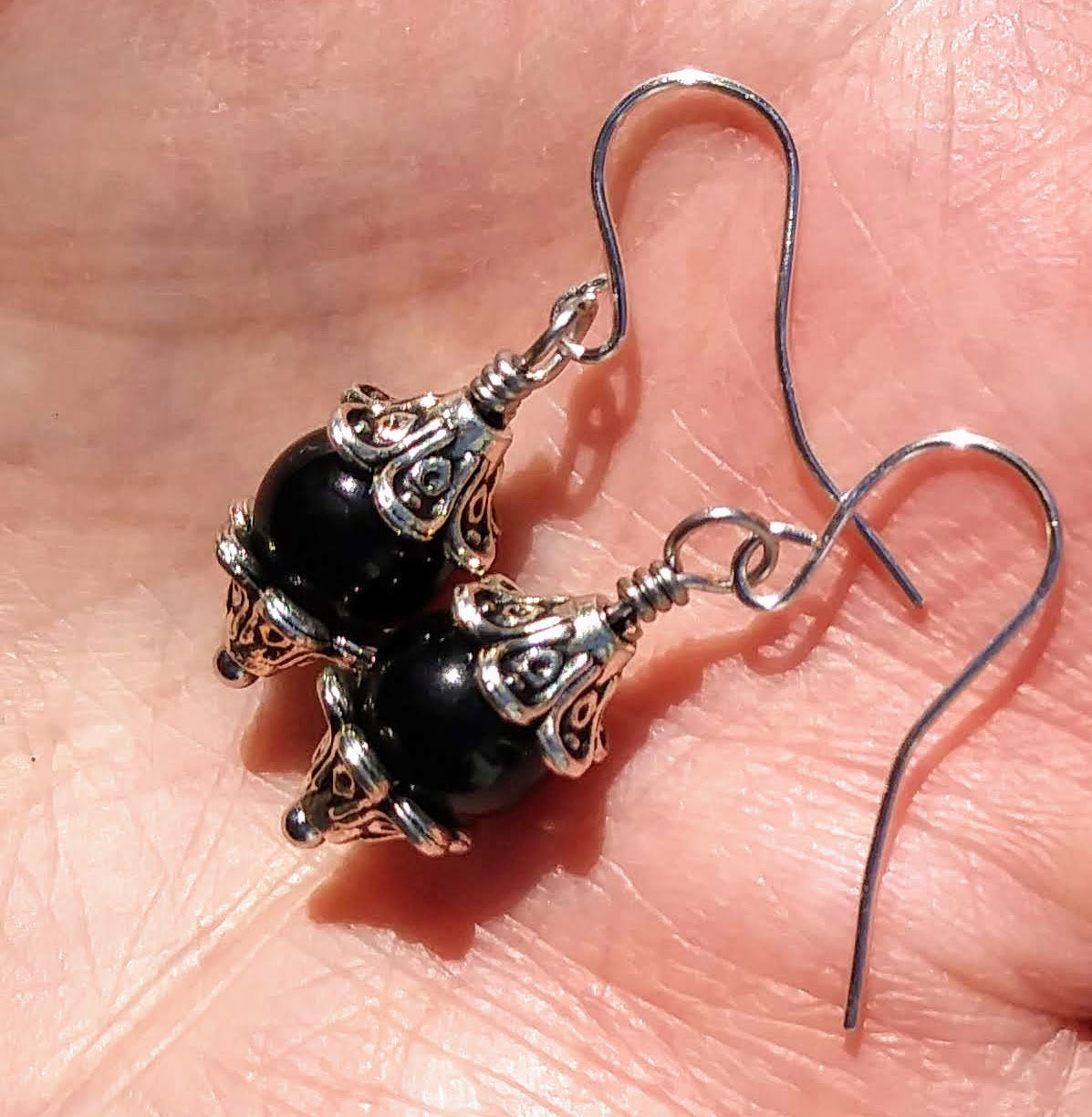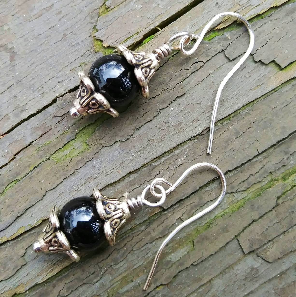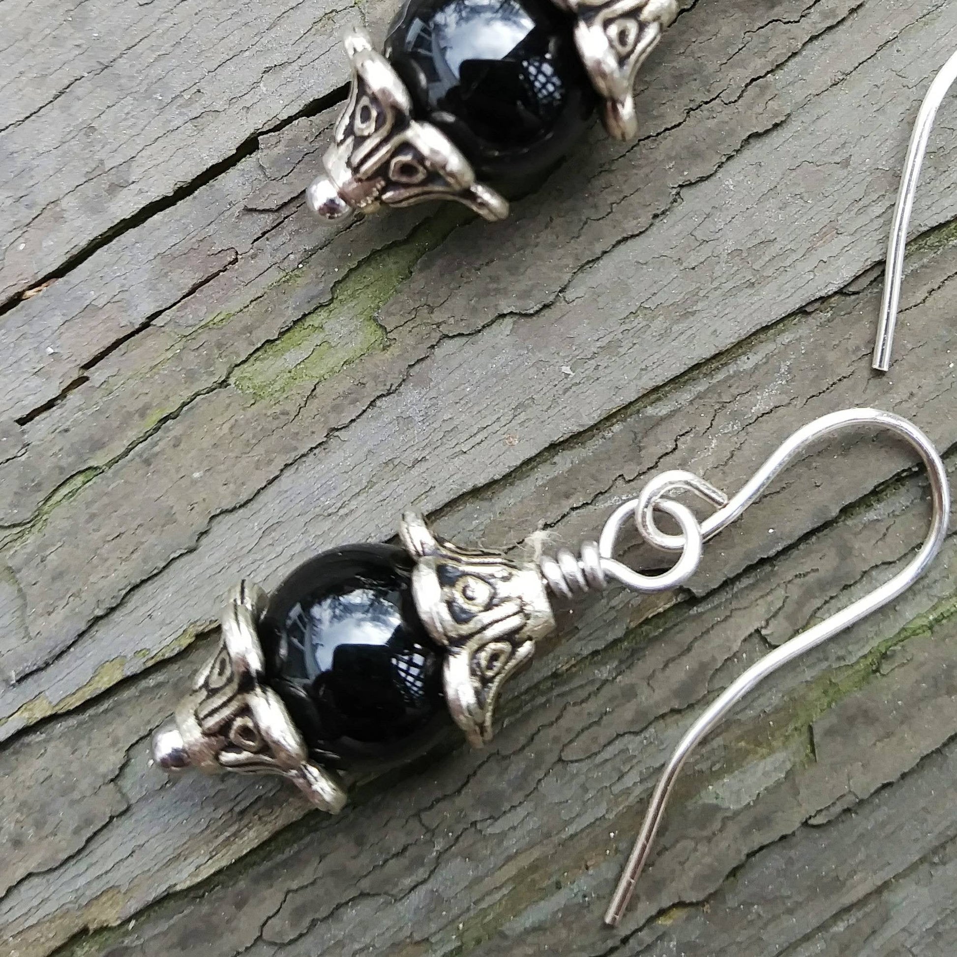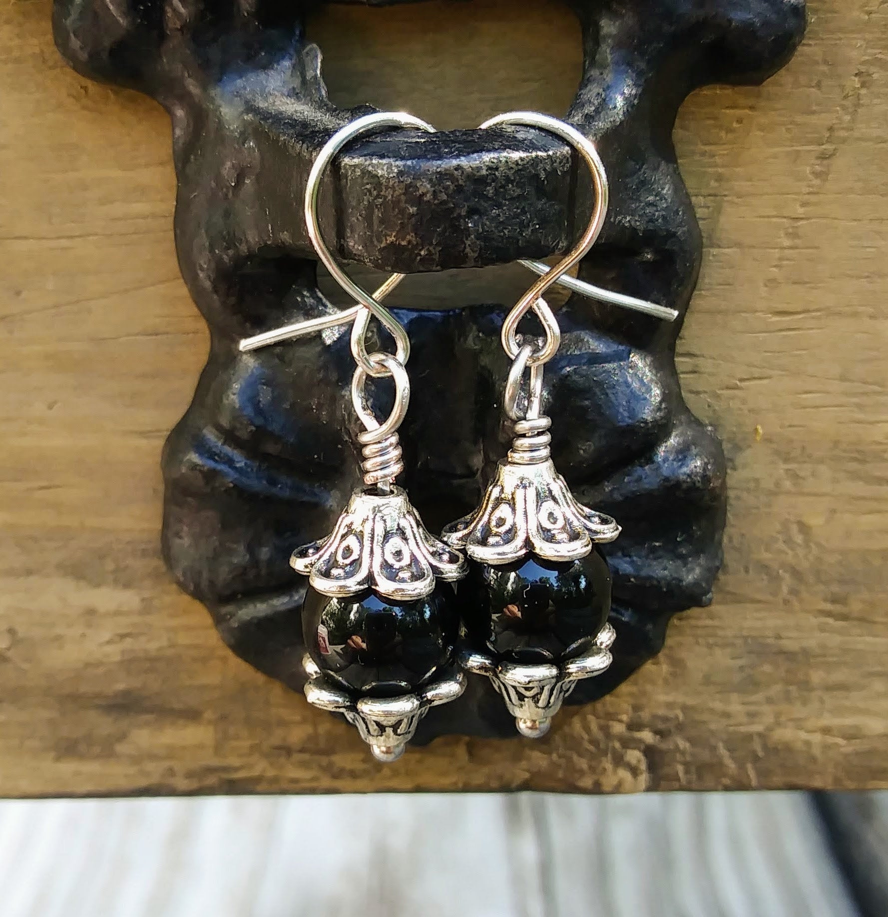 Striking black onyx, classically paired with elegant silver accents that call to mind an Art Nouveau aesthetic. This style is available in several other options, from glass to shell to gemstone and would make a lovely choice for bridal parties. If you don't see your colors, place a custom order!