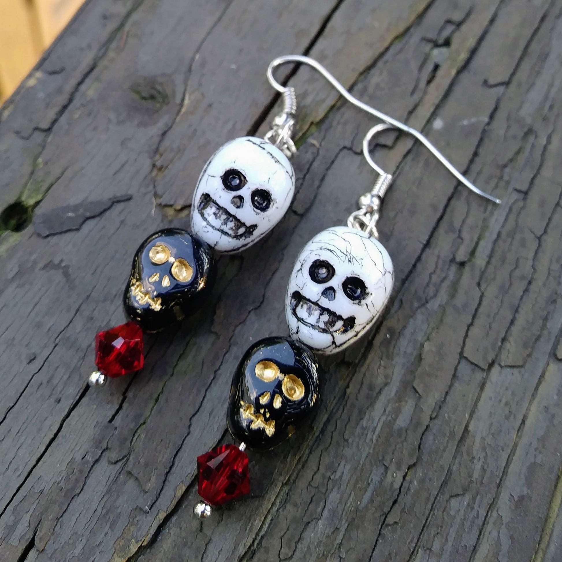 Black Skull White Skull Dangle Earrings with Red Austrian Crystals