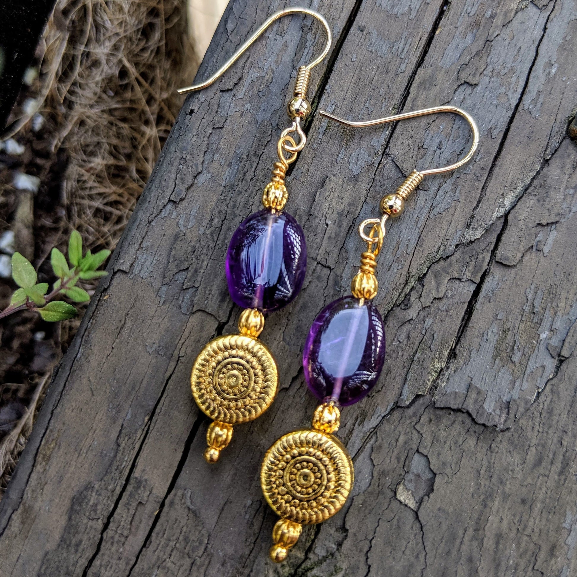 Gold-finished pewter rounds pair with smooth amethyst pebbles. The gold rounds have a distinctive pattern of concentric rings, dots, and swirls.