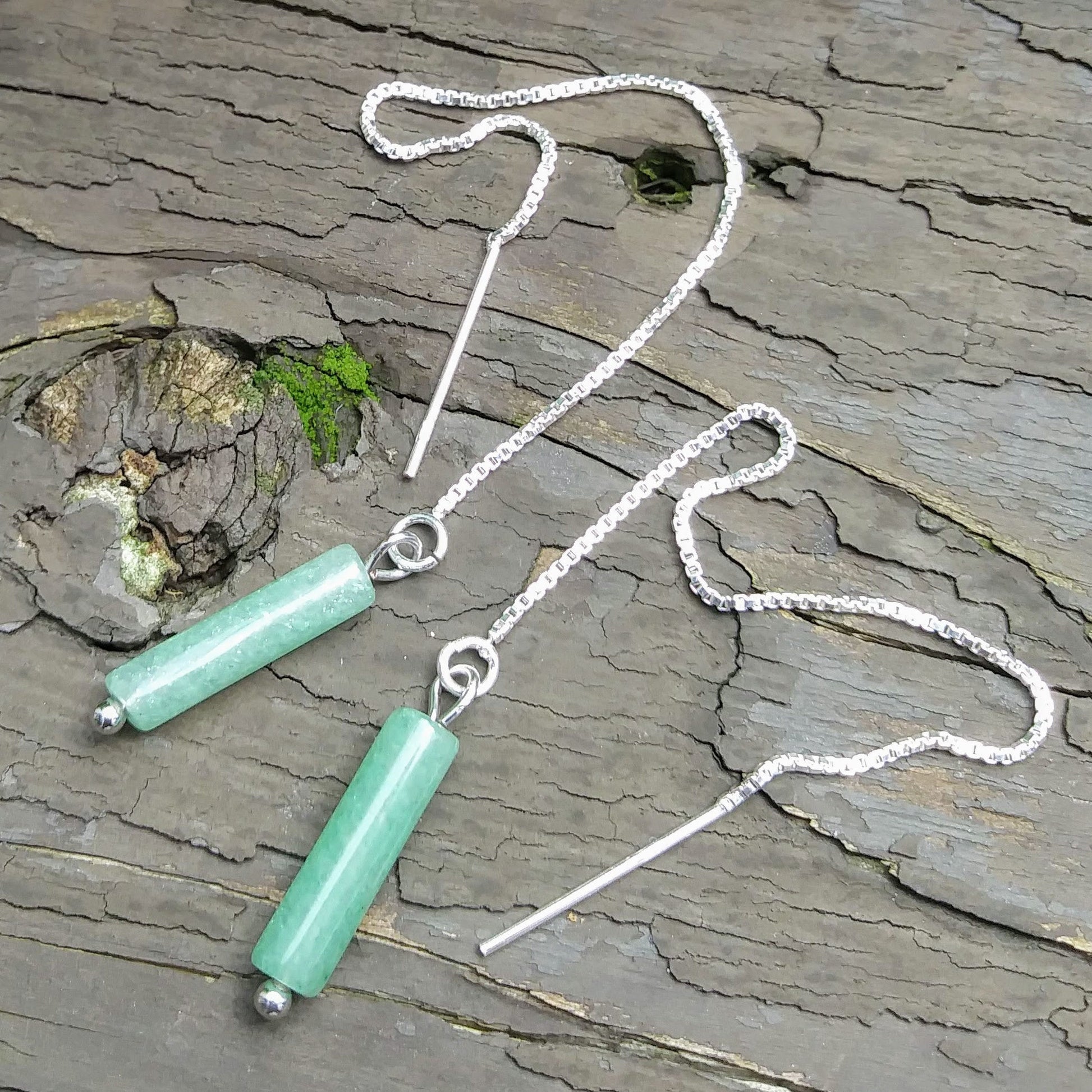 Simple and natural: Sterling silver threader earrings finished with a delicate tube of sparkling green aventurine! The green aventurine tubes have been hand selected to match each other closely in color and length. Aventurine is a form of quartz -- the beauty of its translucent green color is second only to the glittering of its inclusions when hit by the light. These are my personal favorites among our threader selections 🙂