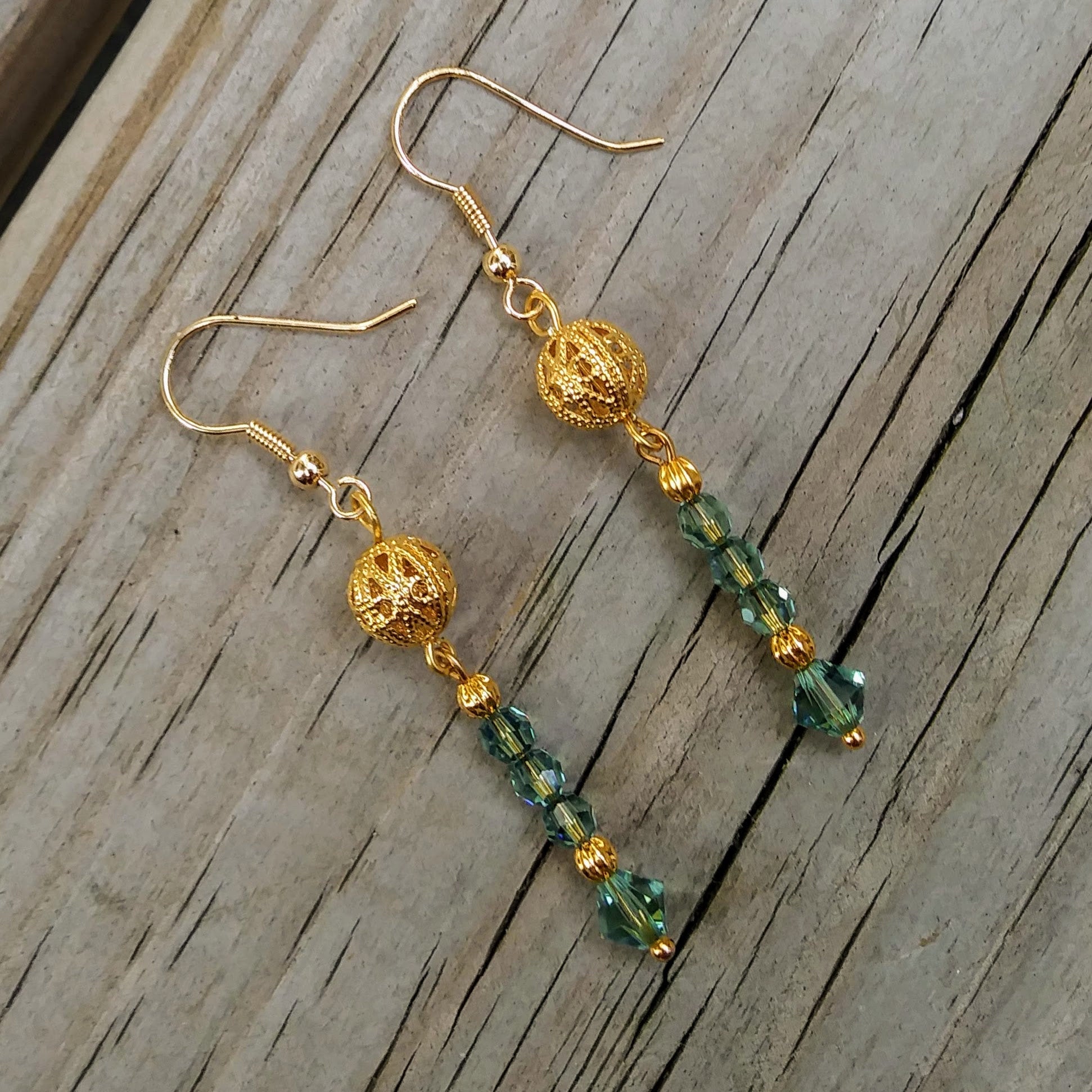 Light Green Austrian Crystal Dangle Earrings w Edwardian Gold Filigree