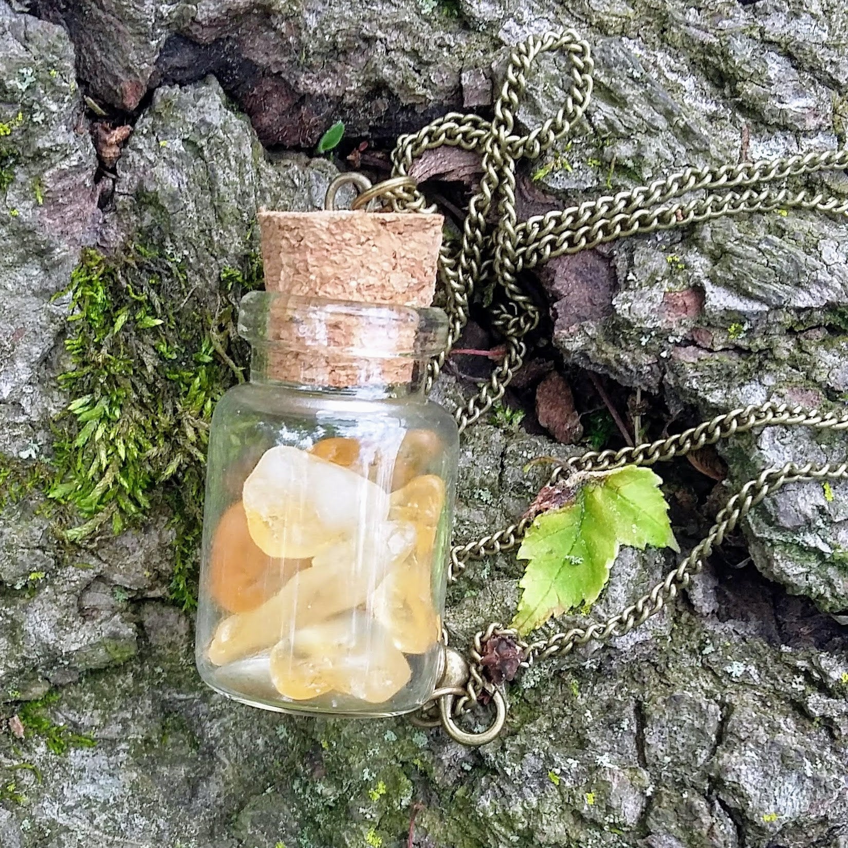 A glass bottle pendant filled with citrine chips hangs on a chain 30.5 inches long. We've been tumbling a load of raw citrine, and at the end of every tumbling stage, there are chips too small to put back into the tumbler, but the perfect size to fill these pendant jars!
