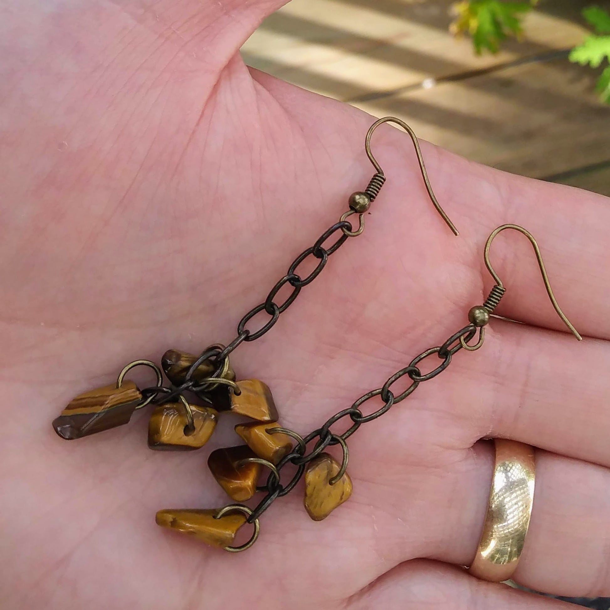 All the gemstones and shell pieces in this assemblage necklace have been upcycled from found necklaces and bracelets!🌞 A central purple & brown shell pendant🌞 Tigers eye chips🌞 Flat chunks of iridescent shell with the look of abalone or paua shellChain details:🌞 New cable-style aged brass chain🌞 New lobster-style clasp 🌞 19 inchesThe style of links allows the necklace to be naturally adjustable in length so that you can find just the right hang to complement your shape and your neckline. (I was able to adjust it down to a 17-inch length and still keep the clasp behind the neck when I tested it on myself.)The four outer shell chunks on the necklace have a slightly different look on either side of them. (You can see both sides of the various shell pieces if you cycle through the photos.)