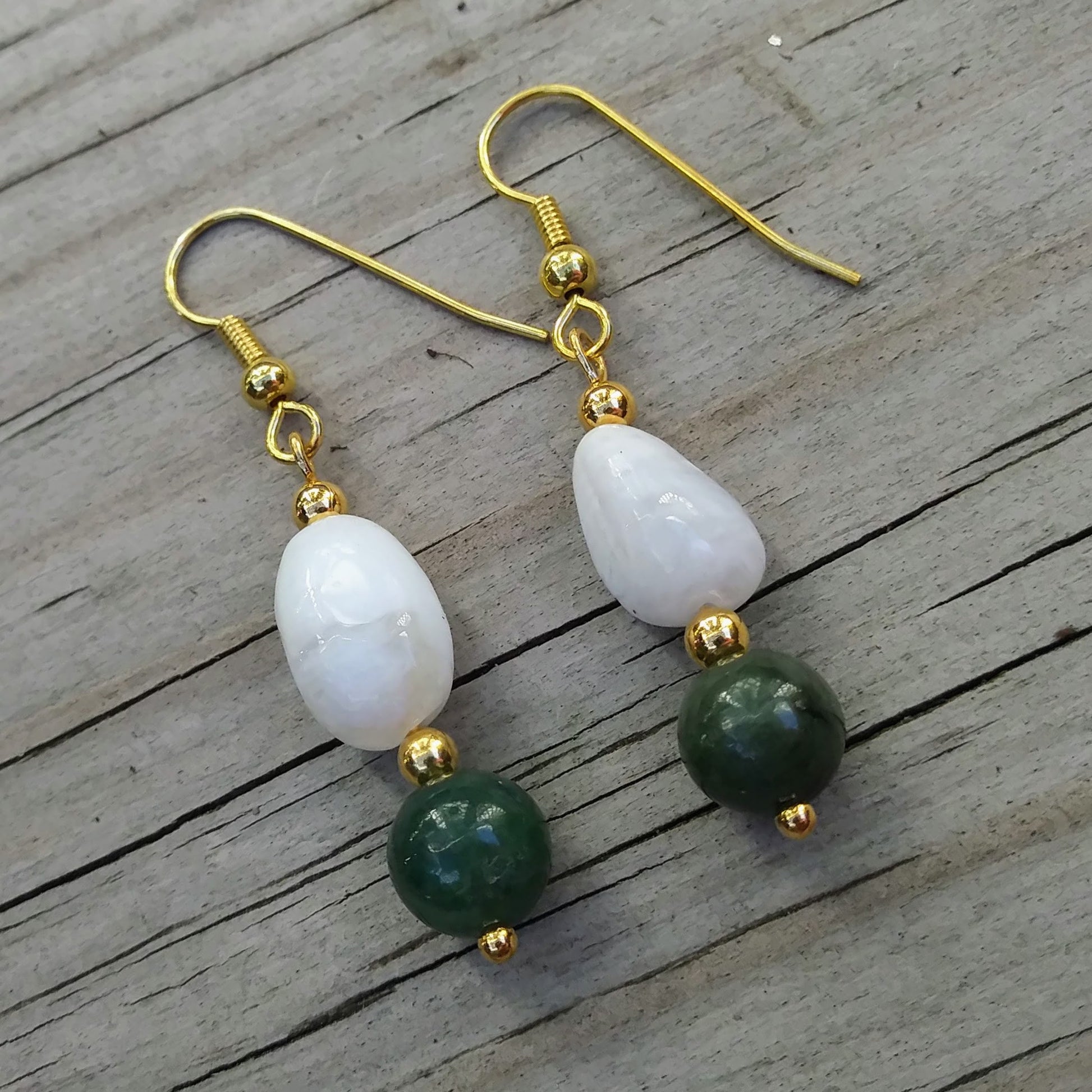 These earrings feature beautiful dark green jade sourced from Canada. There are only two types of jade recognized as genuine jade: nephrite jade and jadeite jade. Both are found in many locations across the globe and trace their history back thousands of years across many cultures.