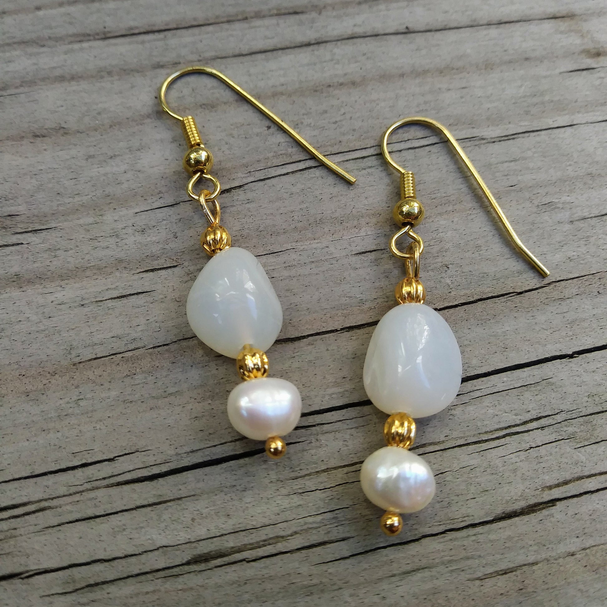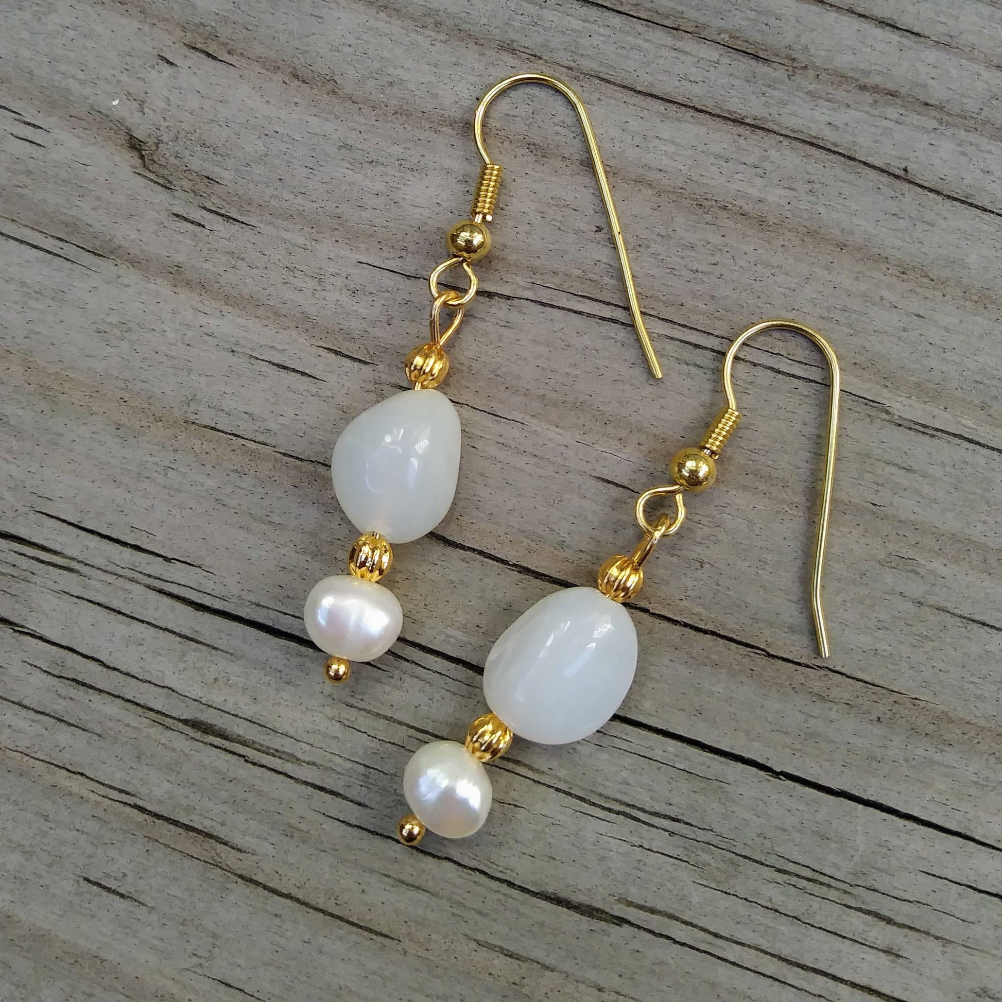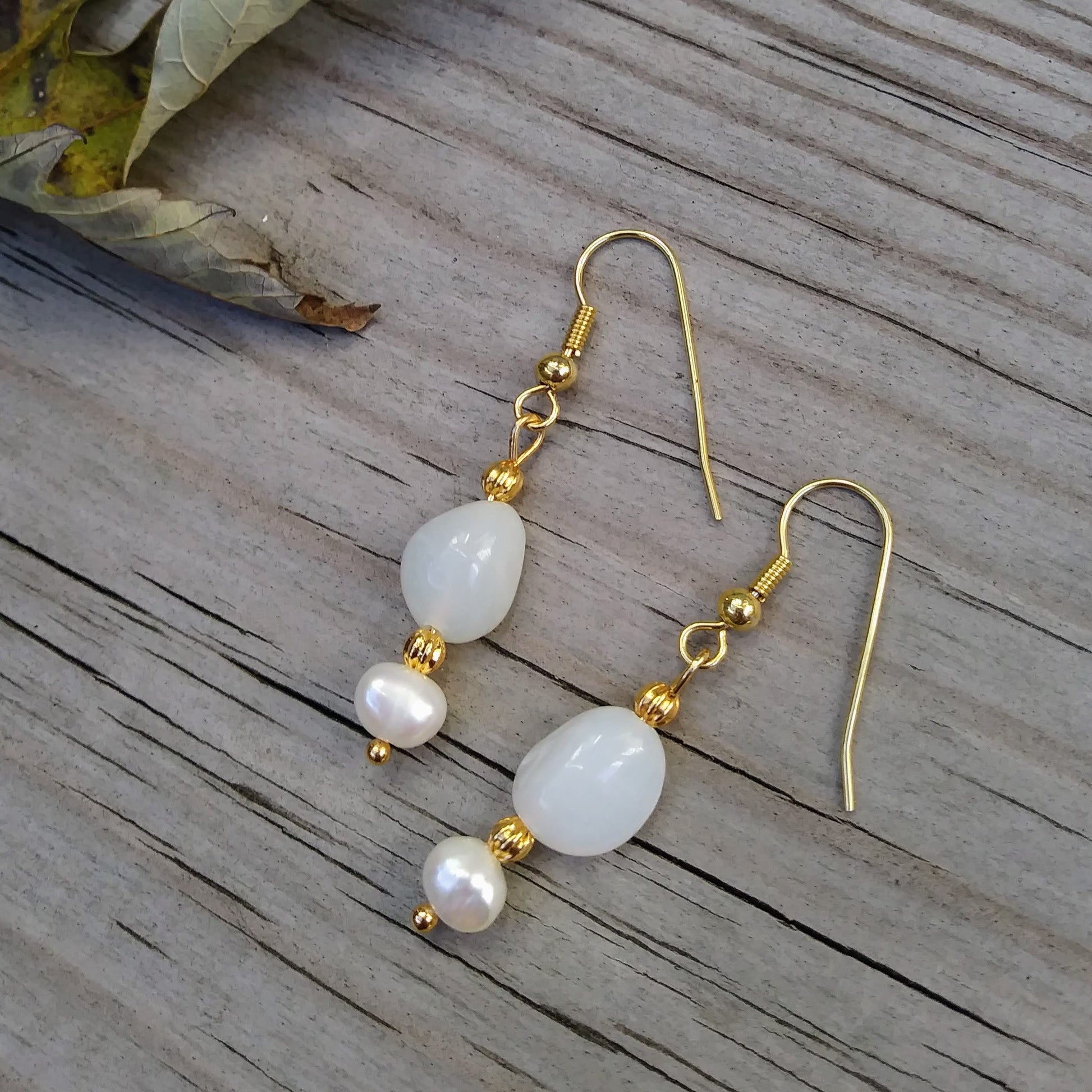Peruvian White Opal Gold Dangle Earrings with Pearl Accents