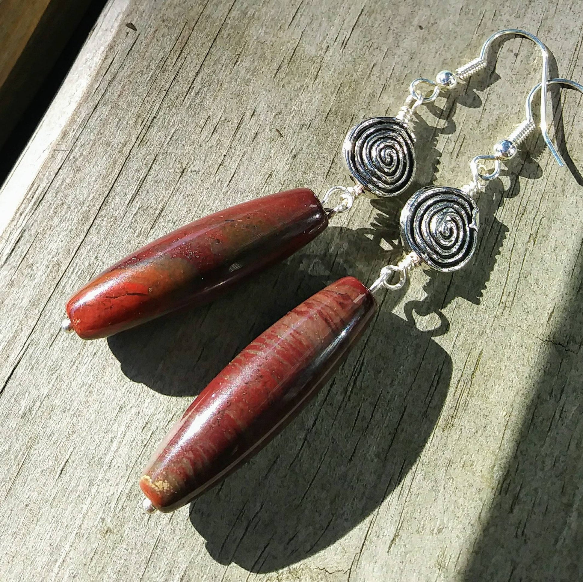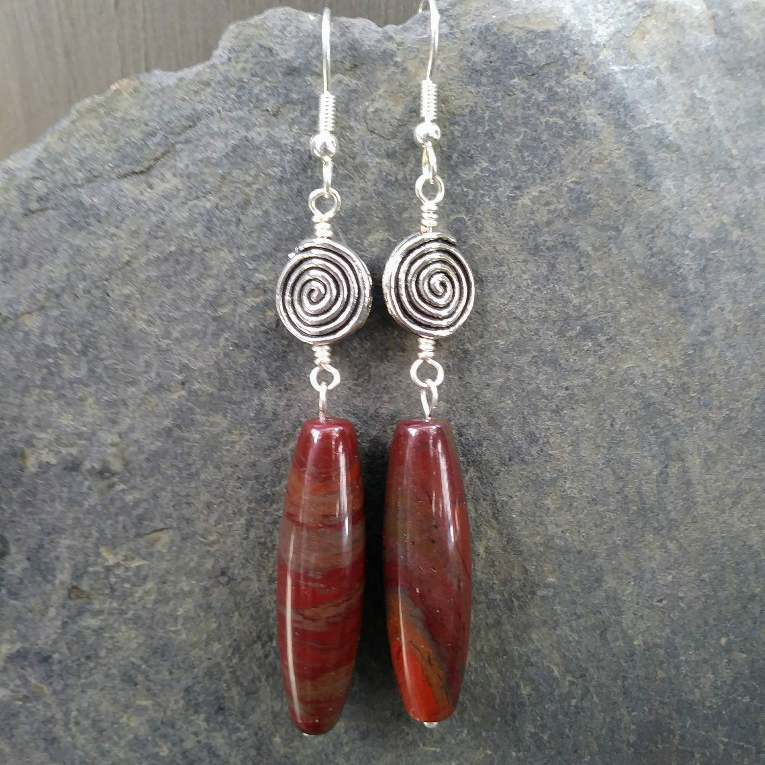 Gorgeous long red jasper stones with faint swirls of charcoal gray hang from round silver spirals in these beautiful statement earrings. Perfect to give as a birthday gift or to keep for yourself as your new favorite pair!