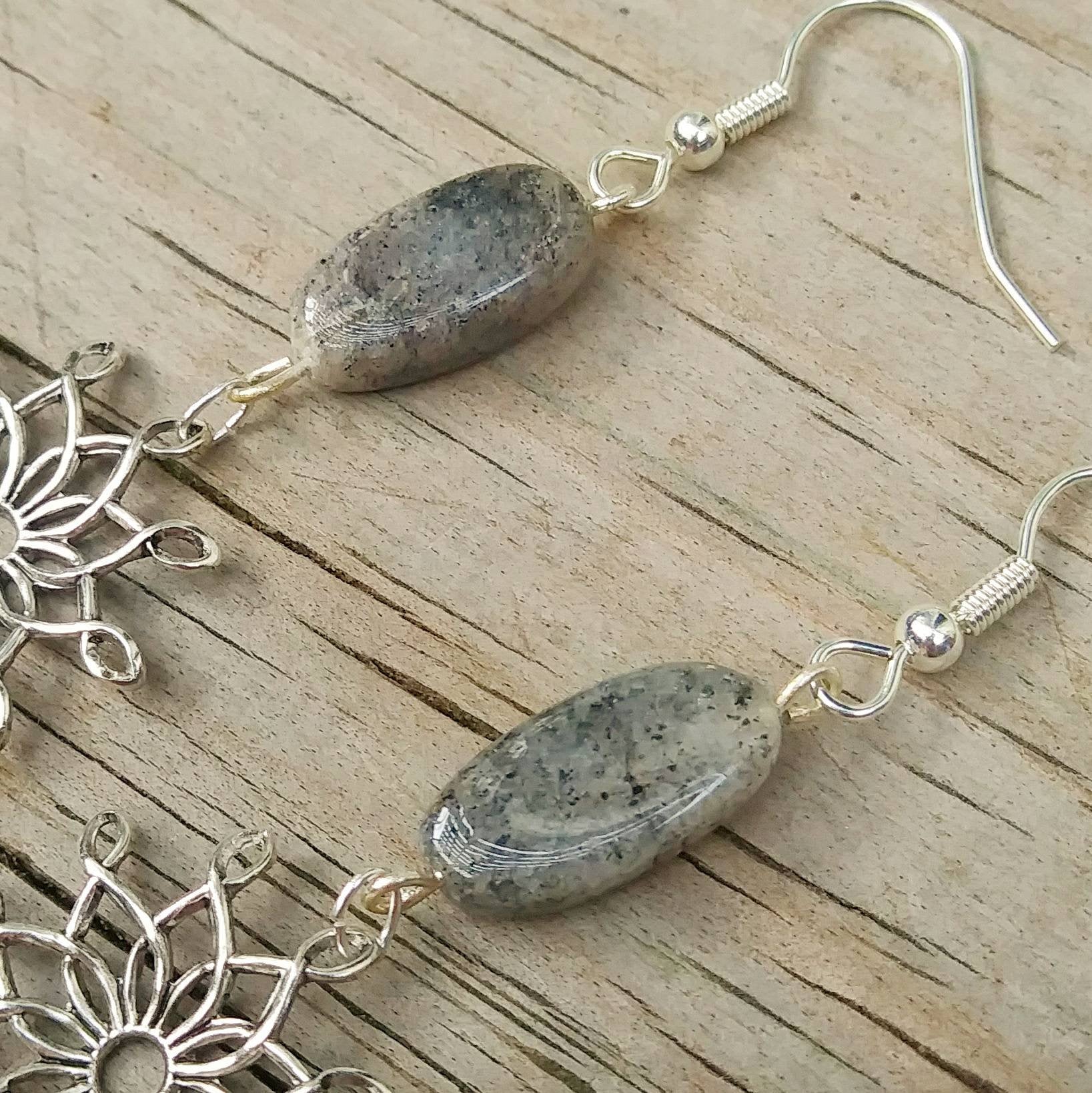Sterling Silver Vintage Starbursts w Spotted Gray Quartz Dangle Earrings
